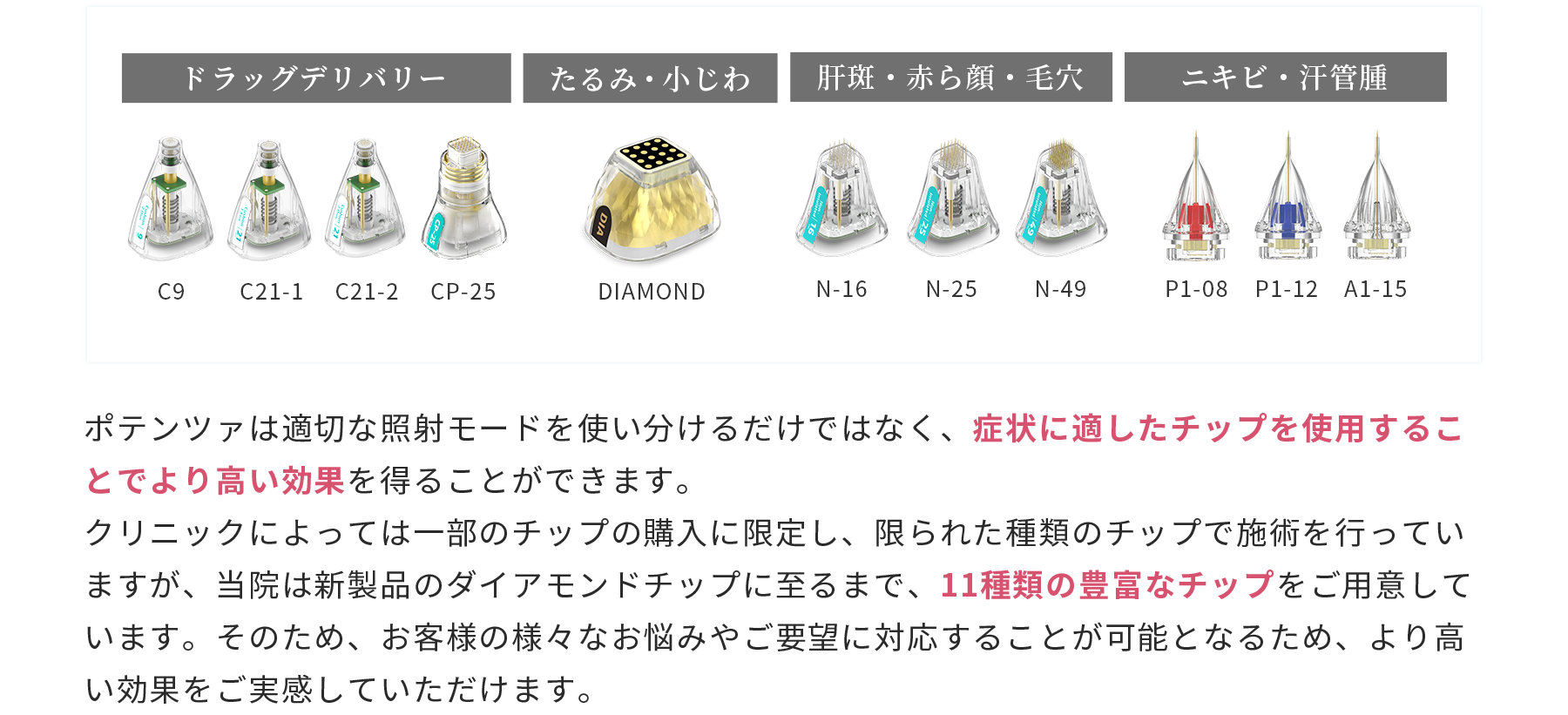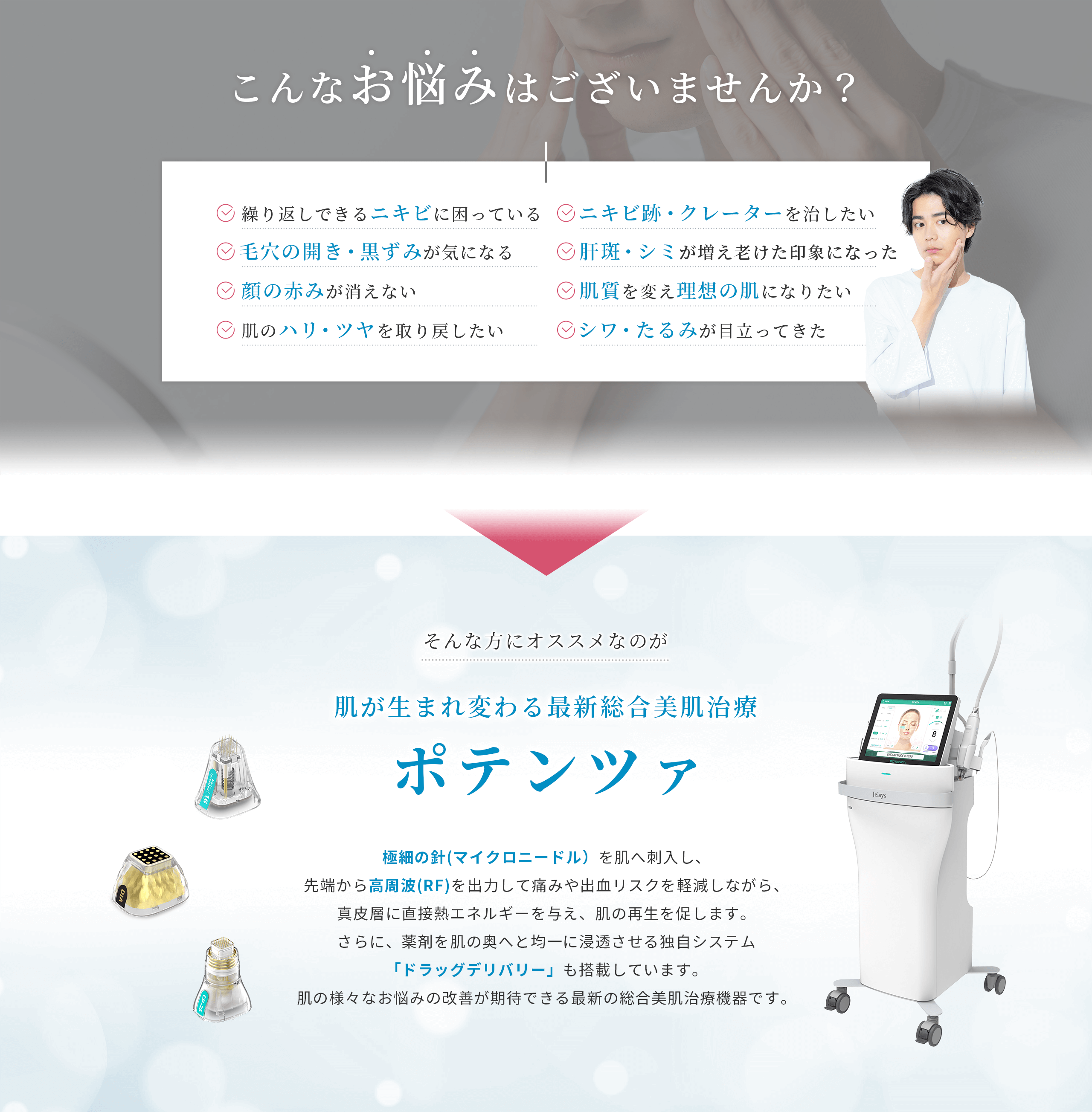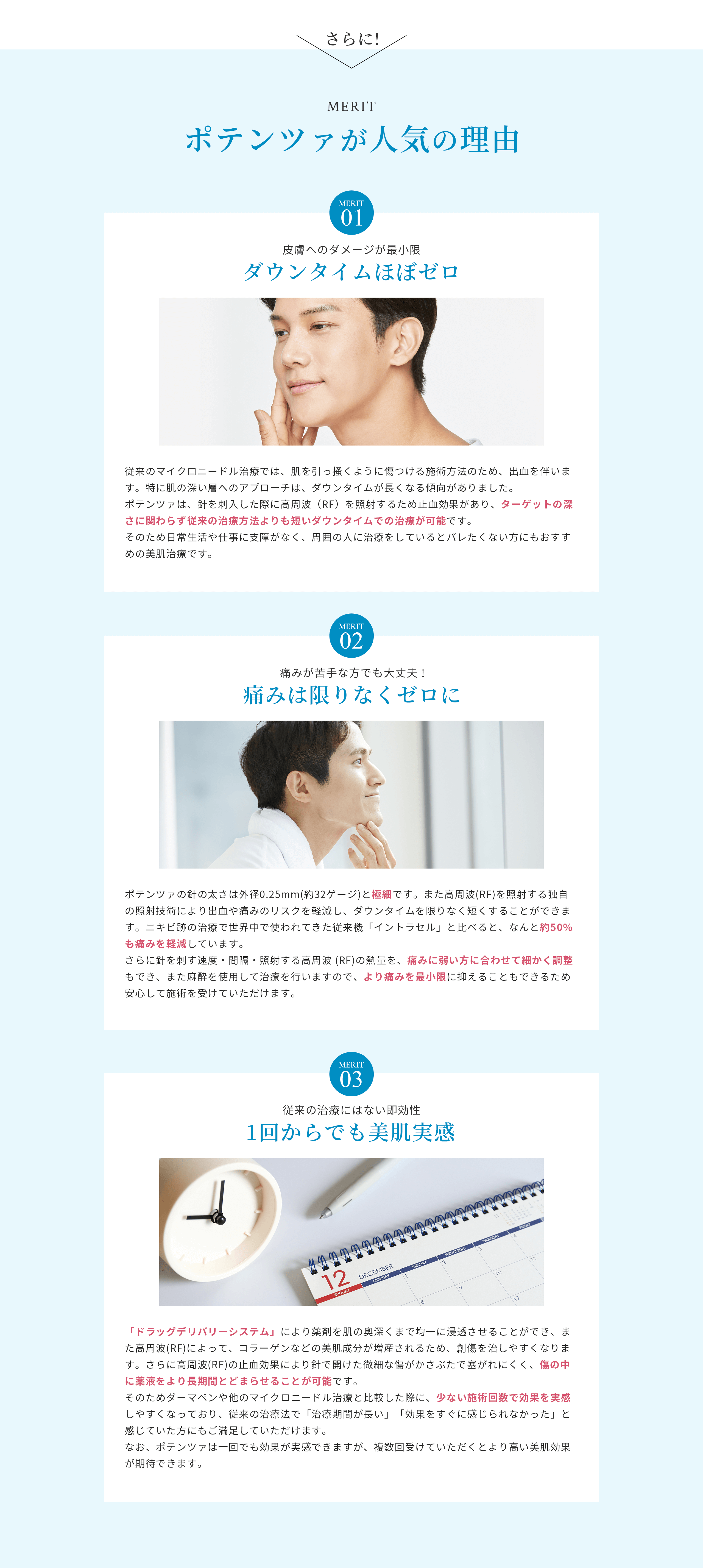 マイクロニードル治療という点では共通していますが、ポテンツァの場合、針を刺入した際に高周波(RF)を照射することによって出血を抑えられるため従来の治療法よりも短いダウンタイムでの治療が可能です。