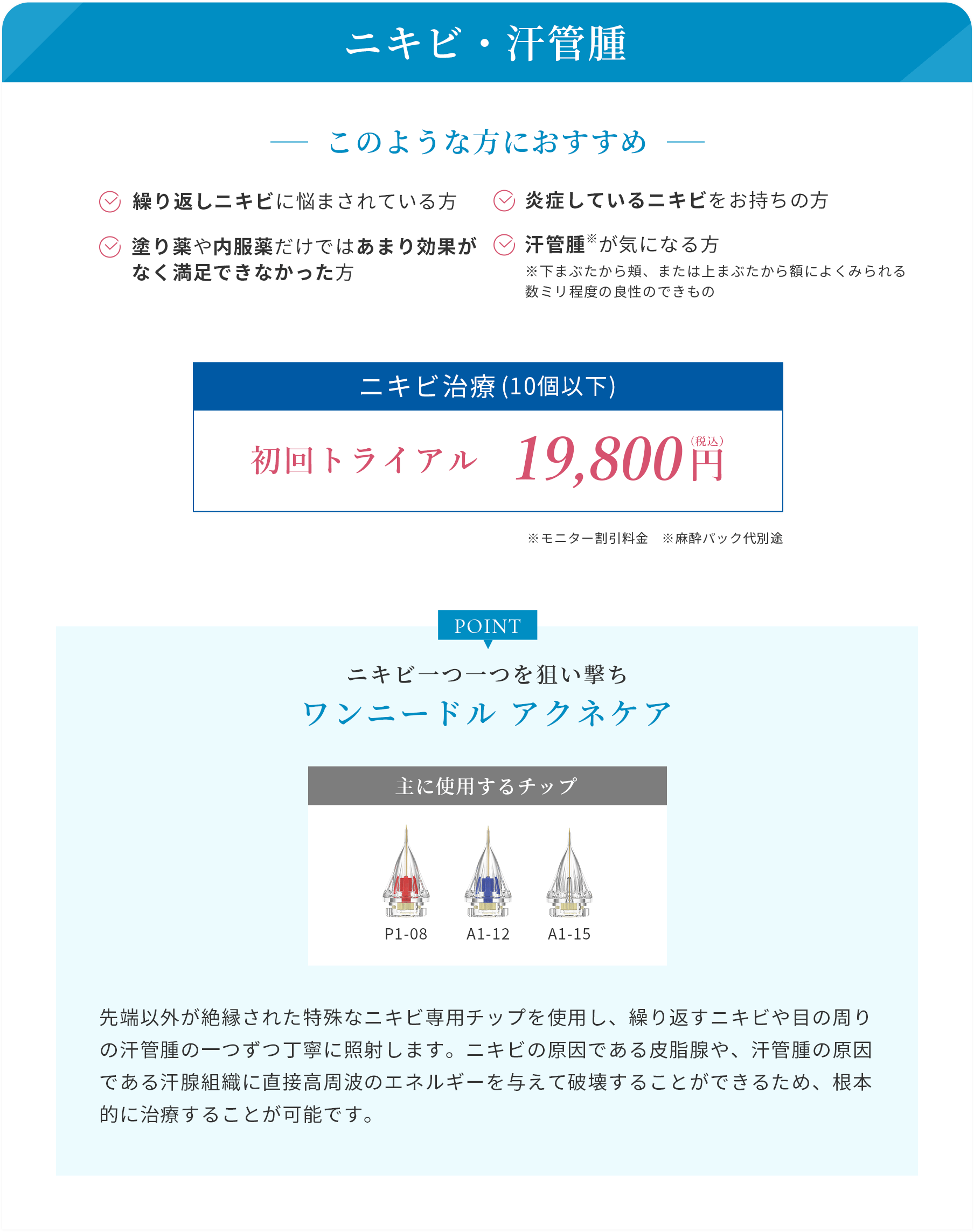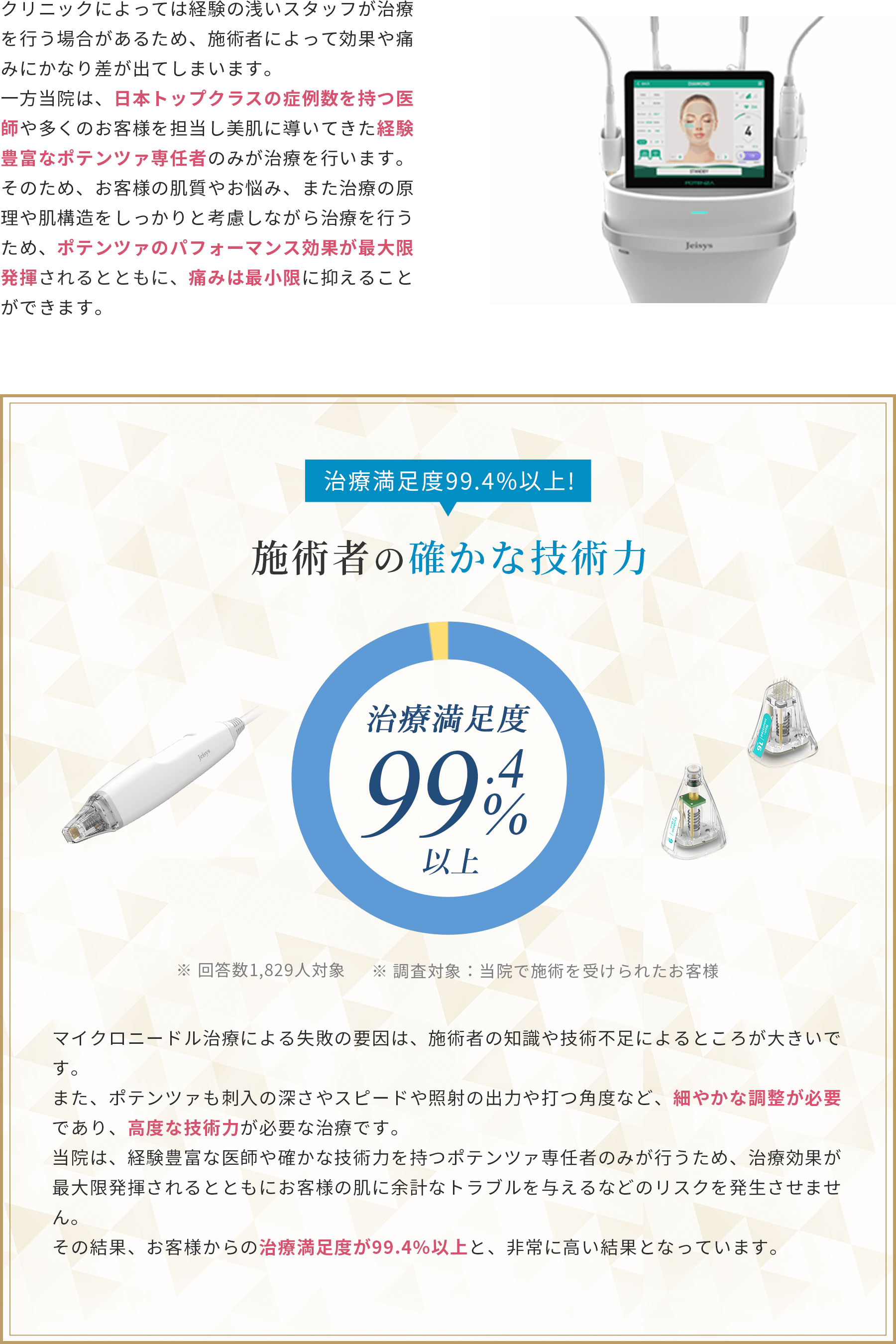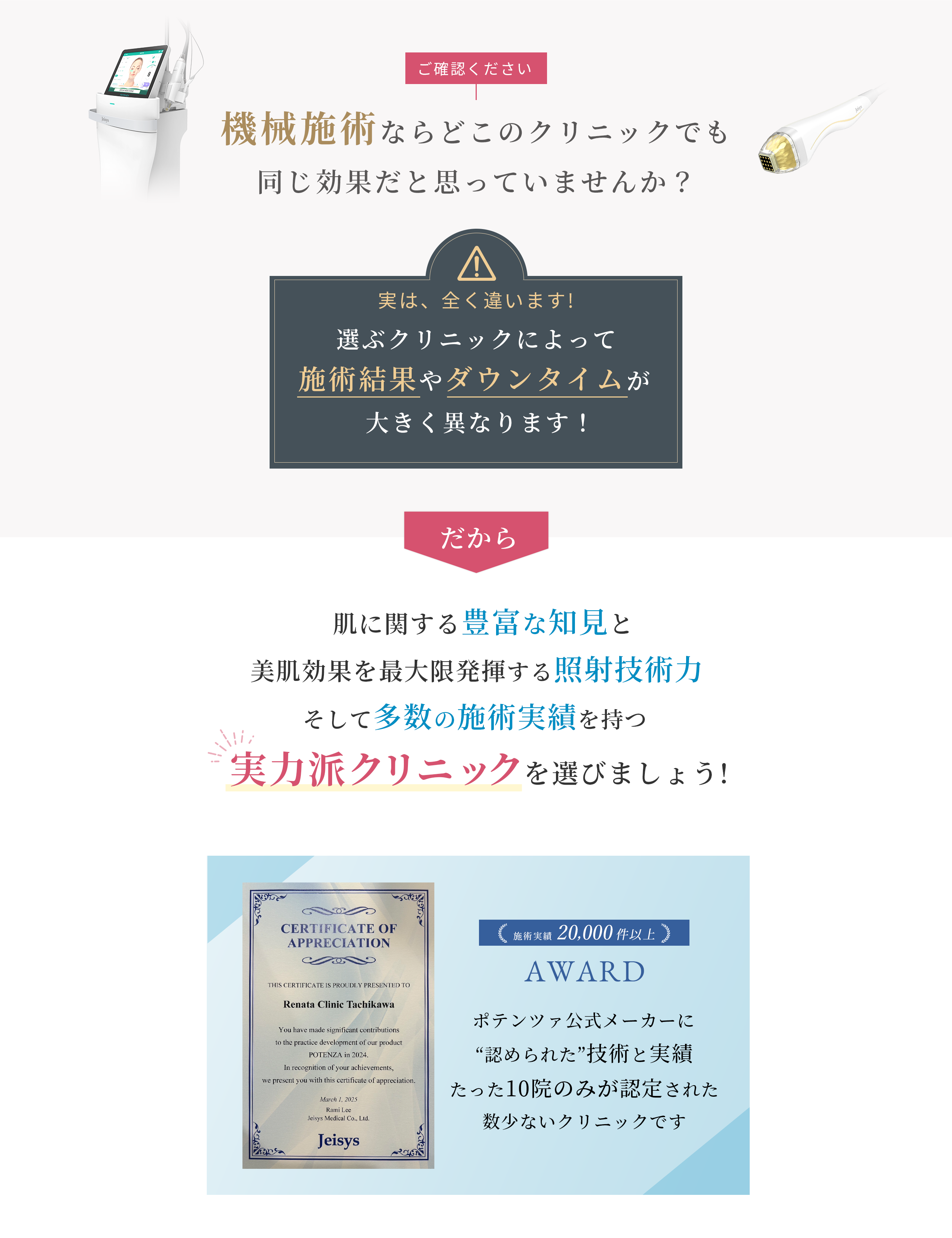 マイクロニードル治療という点では共通していますが、ポテンツァの場合、針を刺入した際に高周波(RF)を照射することによって出血を抑えられるため従来の治療法よりも短いダウンタイムでの治療が可能です。