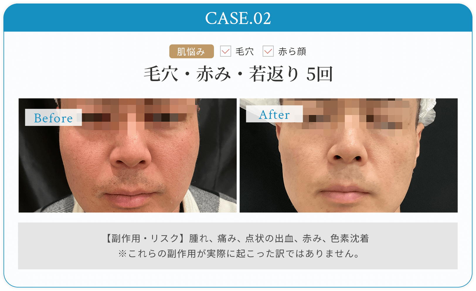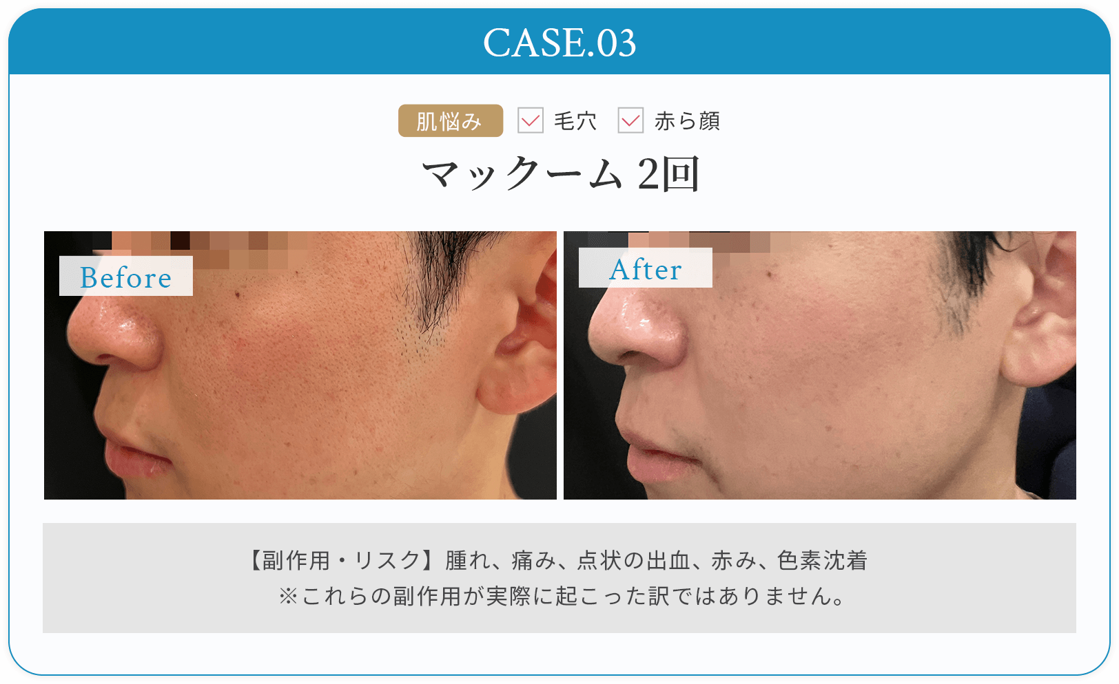治療後は患部に赤みが現れる場合がありますが、1〜2日で消えお化粧で隠せる程度となります。
