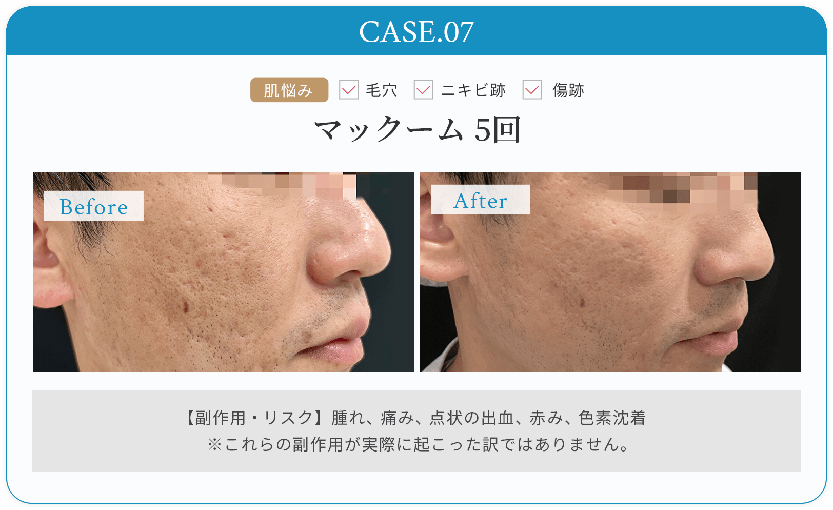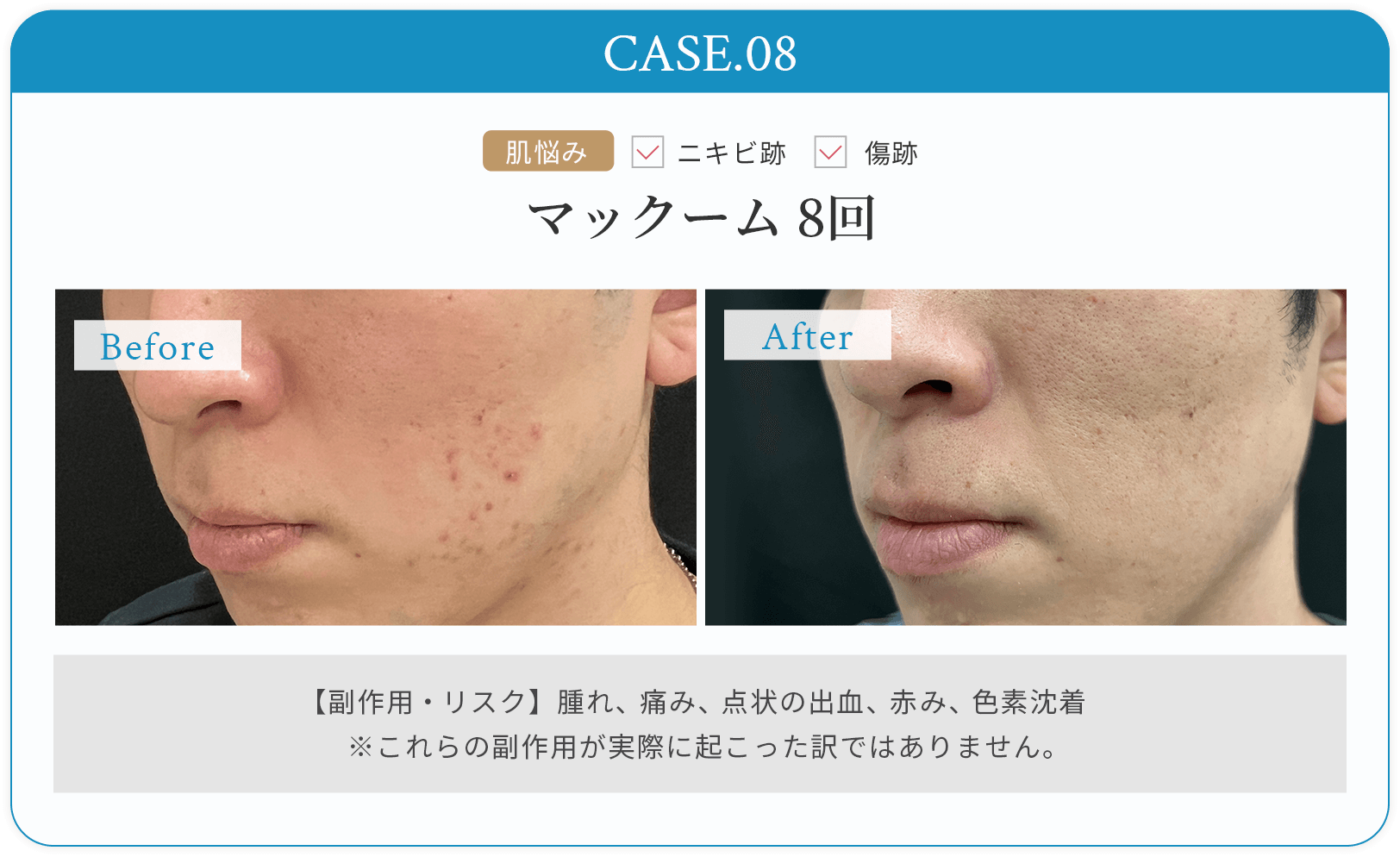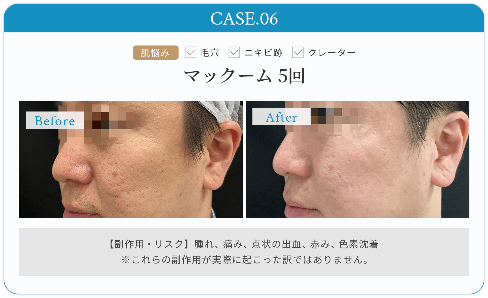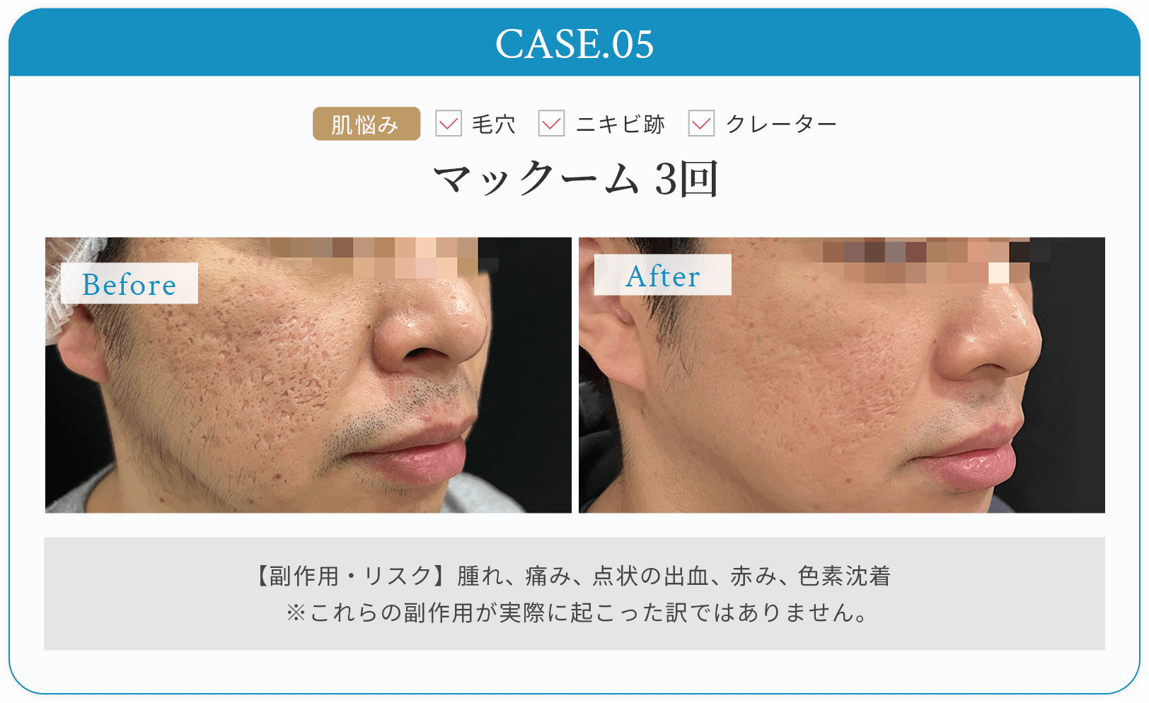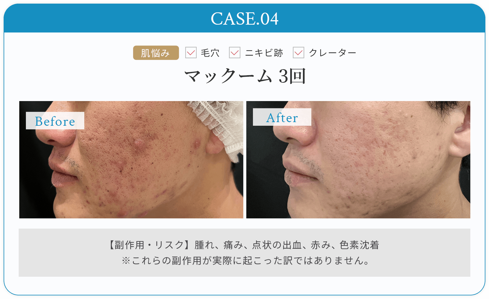 マックームは、ポテンツァ専用に開発されたPLLA(ポリ乳酸)製剤です。体内で数ヶ月〜約2年かけて水分と二酸化炭素に分解され、アレルギー反応がない安全な成分です。真皮層にマックームを届けることにより、線維芽細胞を刺激しコラーゲンの増殖を促します。特にニキビ跡・クレーター・毛穴などの改善に効果を発揮します。