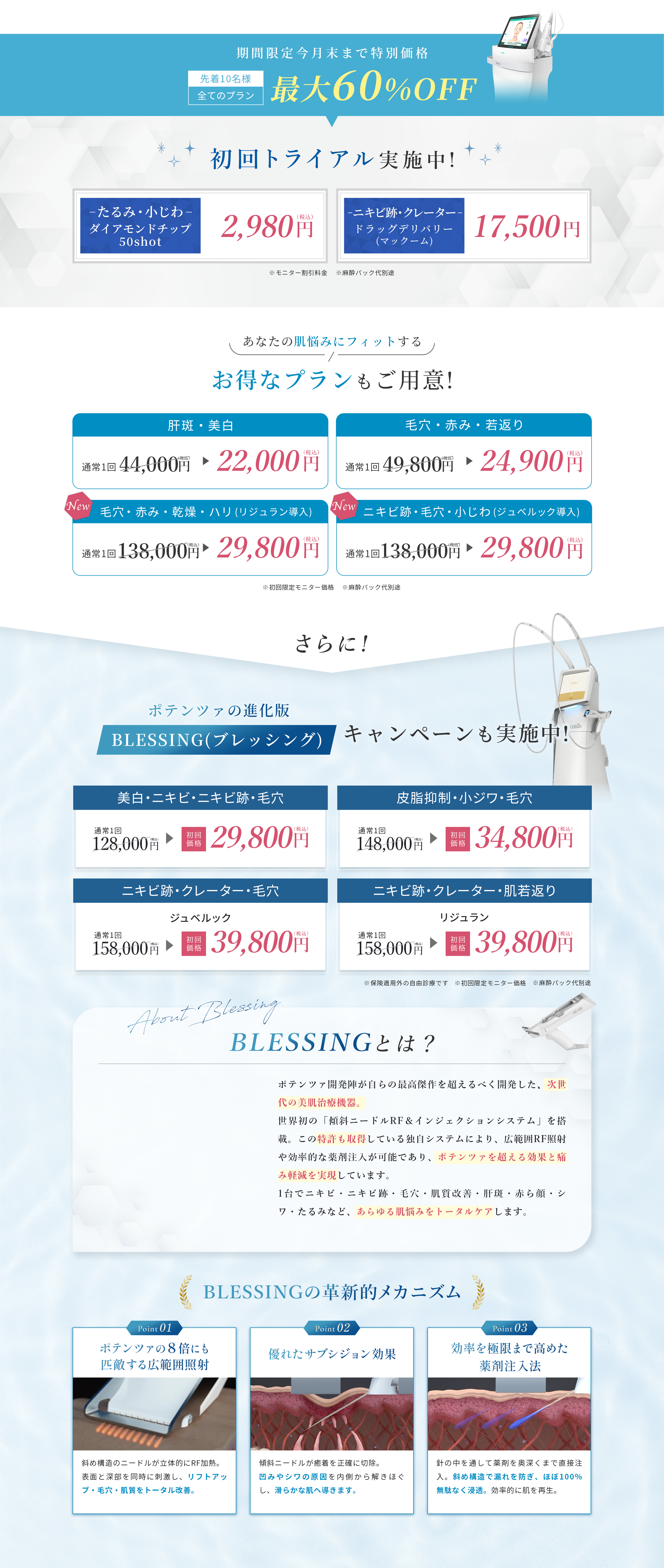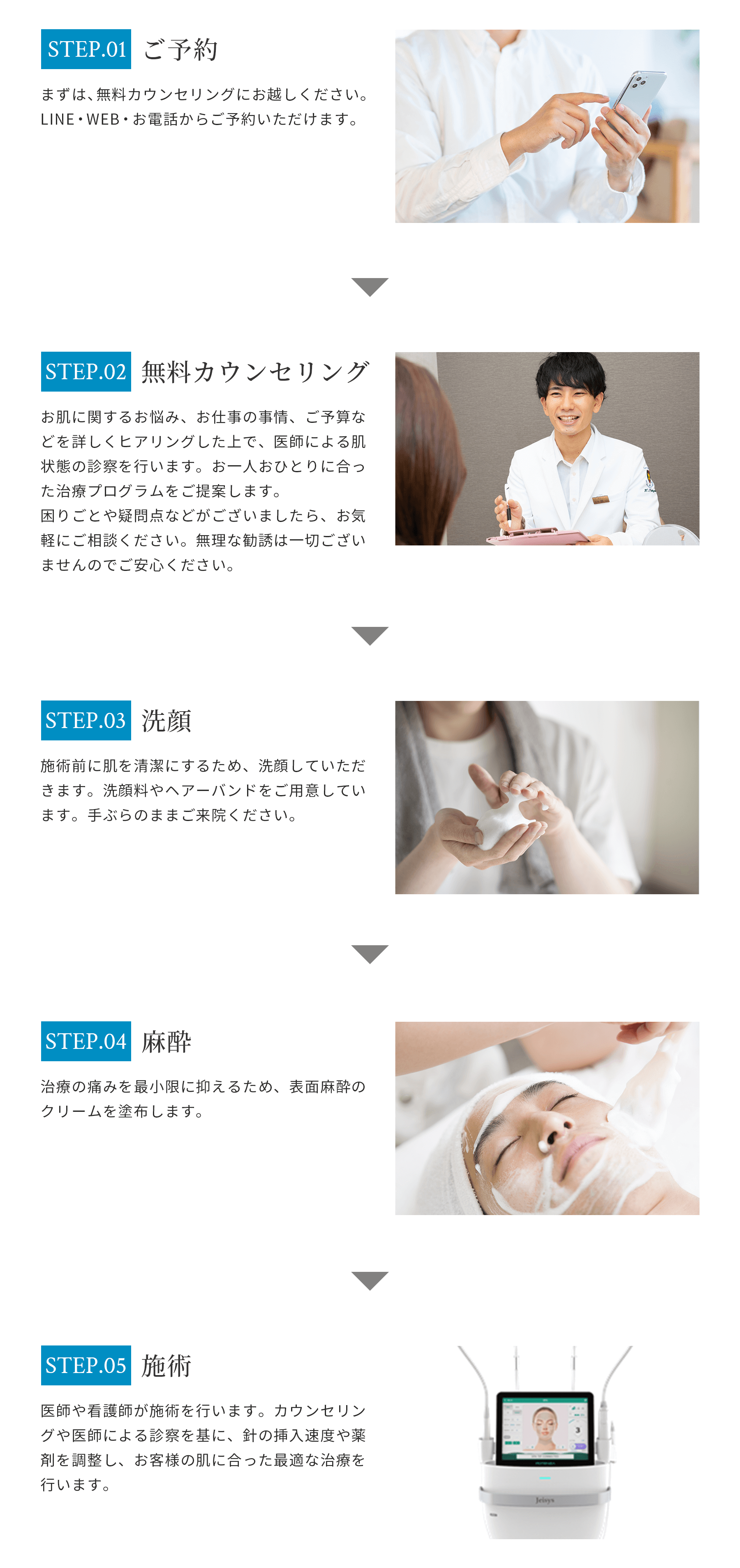 施術頻度は2〜4週間おきに受けることをおすすめしております。お客様一人ひとりの肌のお悩みやご要望により最適なプランをご提案しますのでカウンセリング時にぜひご相談ください。