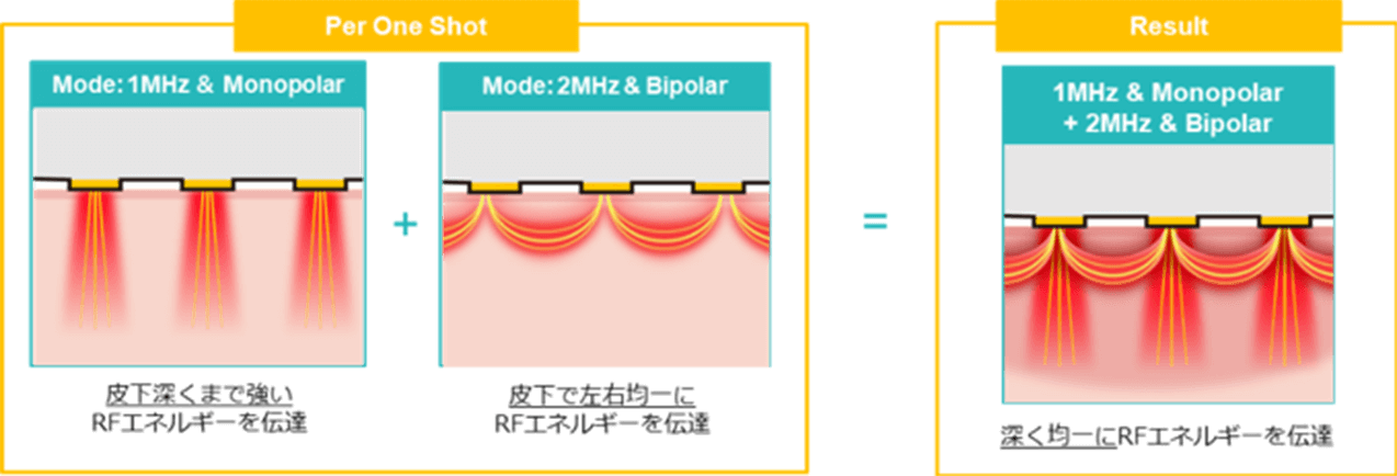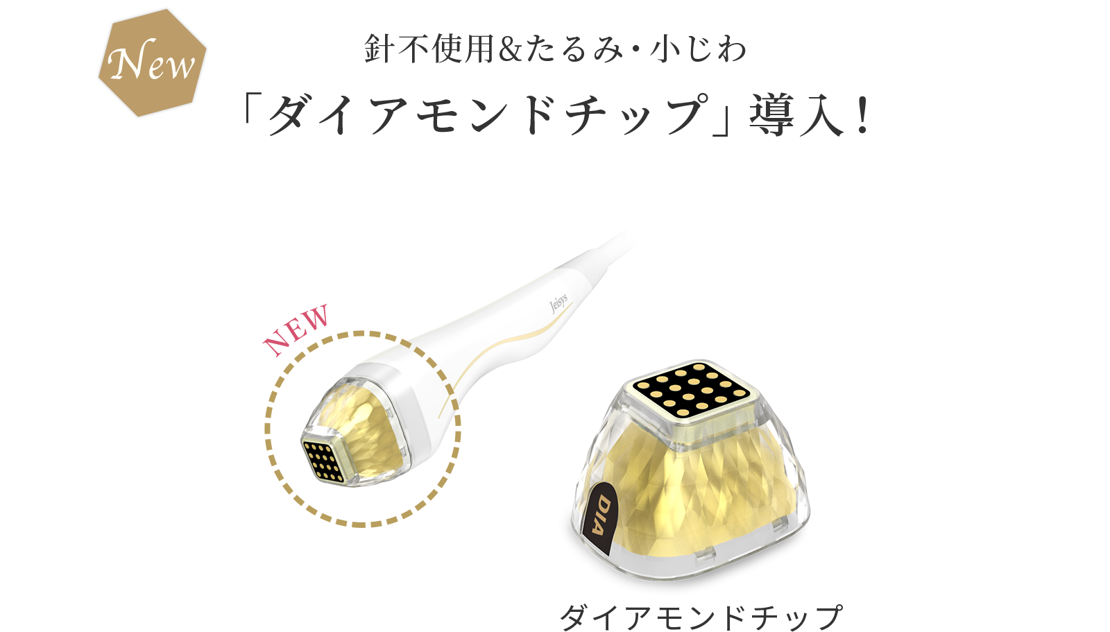 ダイアモンドチップは、針を使わないノンニードルタイプのチップです。1ショットでモノポーラとバイポーラという異なる電極を高周波で連続照射することで、お肌の浅い層からより深い層まで全体的に肌を引き締めることができると同時に、真皮の若返りにも効果が期待できます。また、熱を肌に伝えることで、熱影響を受けた線維芽細胞が中長期的にコラーゲンとエラスチンの増生を促すため、肌にハリやツヤ感が増します。