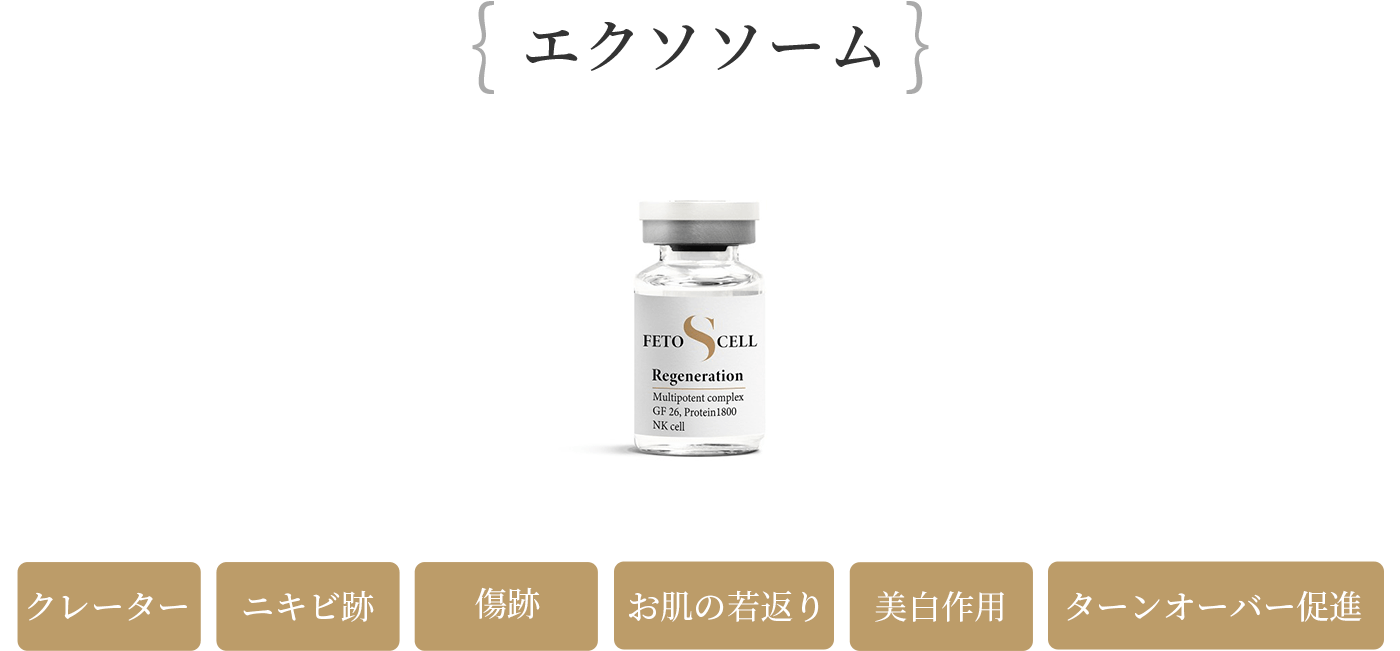 エクソソームは脂肪由来・歯髄由来・骨髄由来・臍帯血由来の4つの中から主に抽出されています。当院のエクソソームは「臍帯幹細胞由来」です。臍帯血由来は妊娠時に赤ちゃんと母体を繋ぐ臍帯から採取した幹細胞であるため、市場にたった1%しか出回らないといわれている大変貴重な成分です。赤ちゃんにとって必要なあらゆる栄養素や、若い細胞が豊富に入った成長因子が多く含まれているため、他組織由来に比べてエクソソームの量や効果が格段に良く、高い細胞再生力があります。