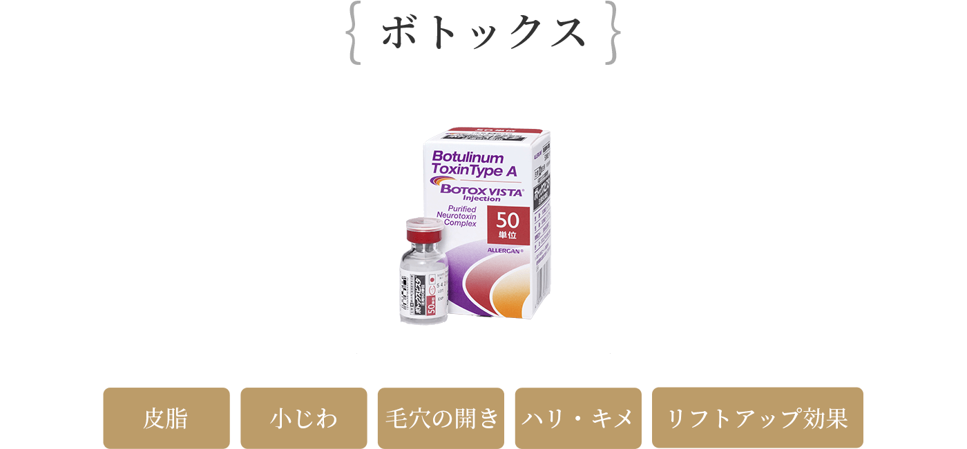 ボトックス(ボツリヌストキシン)とはボツリヌス菌が作り出したタンパク質の成分です。ポテンツァでボトックスを導入することにより額・眉間・目じりなどの表情シワを改善し、定期的に治療することで将来的にできるシワを予防することができます。また筋肉の表面線維のみの働きを抑えることができるため毛穴の引き締め、なめらかでハリのあるお肌、リフトアップ効果が期待できます。