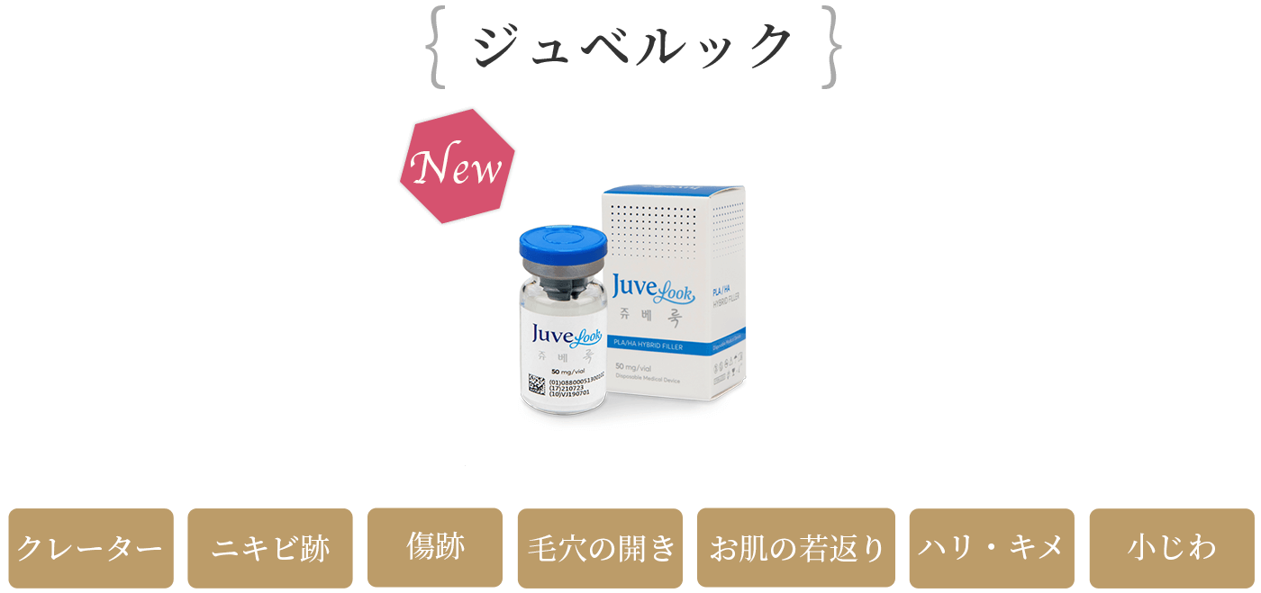 ジュベルックを注入することで、自己コラーゲンの産出が促進され、お肌のハリ感UP、毛穴の縮小、ニキビ跡、クレーター、小じわの改善が期待できます。