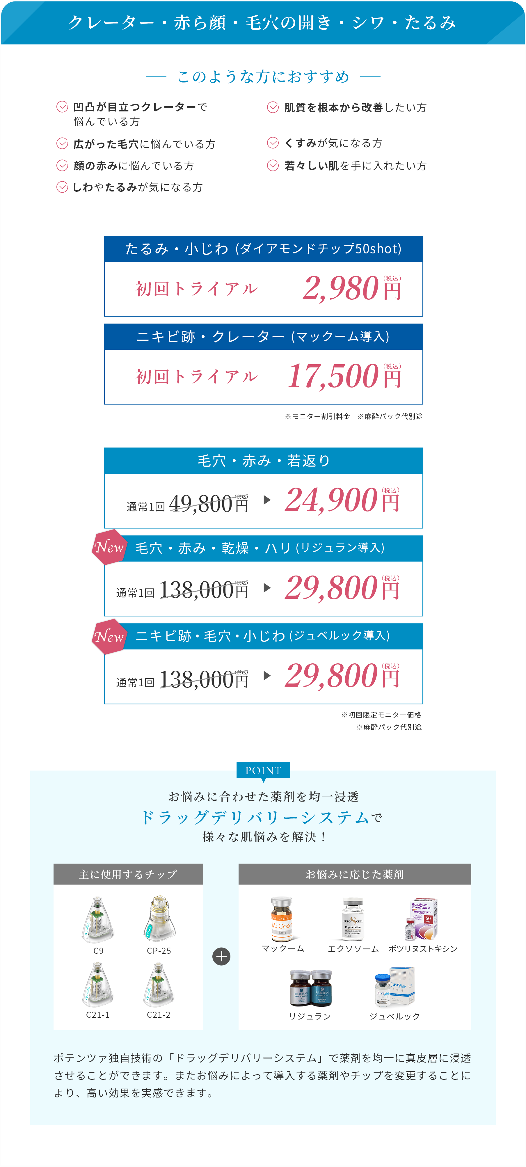 また、独自のドラッグデリバリーシステムにより、薬剤を確実に肌の深部まで浸透させるため、治療効果が高まります。